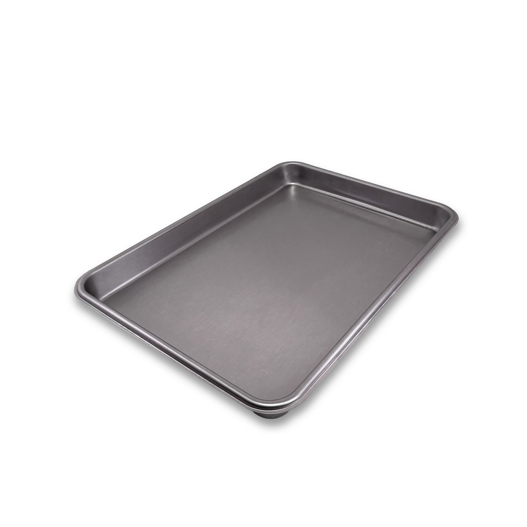 Measurement chart of a rectangular pan with dimensions and weight on a white background